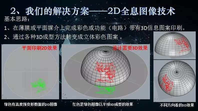 先做出2D平面效果,經(jīng)拉伸而形成3D產(chǎn)品。這種方式是谷教授正在研究,并已在部分家電上應(yīng)用的課題——2D全息圖像技術(shù)。整體流程如下: