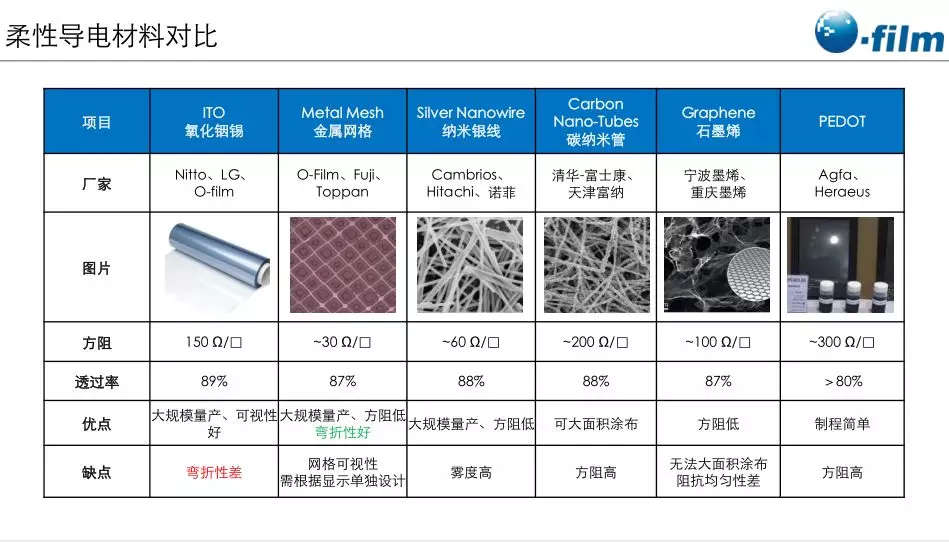 車(chē)載智能顯示屏的設(shè)計(jì)趨勢(shì)是曲面與折疊,而實(shí)現(xiàn)這些效果必備的是柔性O(shè)LED,這種材料將因此迎來(lái)蓬勃發(fā)展。通過(guò)對(duì)比分析,姬總講解了當(dāng)前各種柔性電子材料的優(yōu)缺點(diǎn),隨后從發(fā)展、制程、設(shè)計(jì)、結(jié)構(gòu)、基材(特別是COP)詳細(xì)的介紹了歐菲光生產(chǎn)的金屬網(wǎng)格柔性觸控的具體現(xiàn)狀。